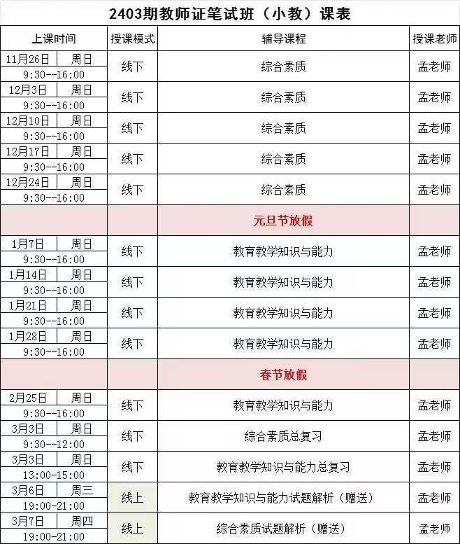 2403期小学教师资格证笔试培训计划